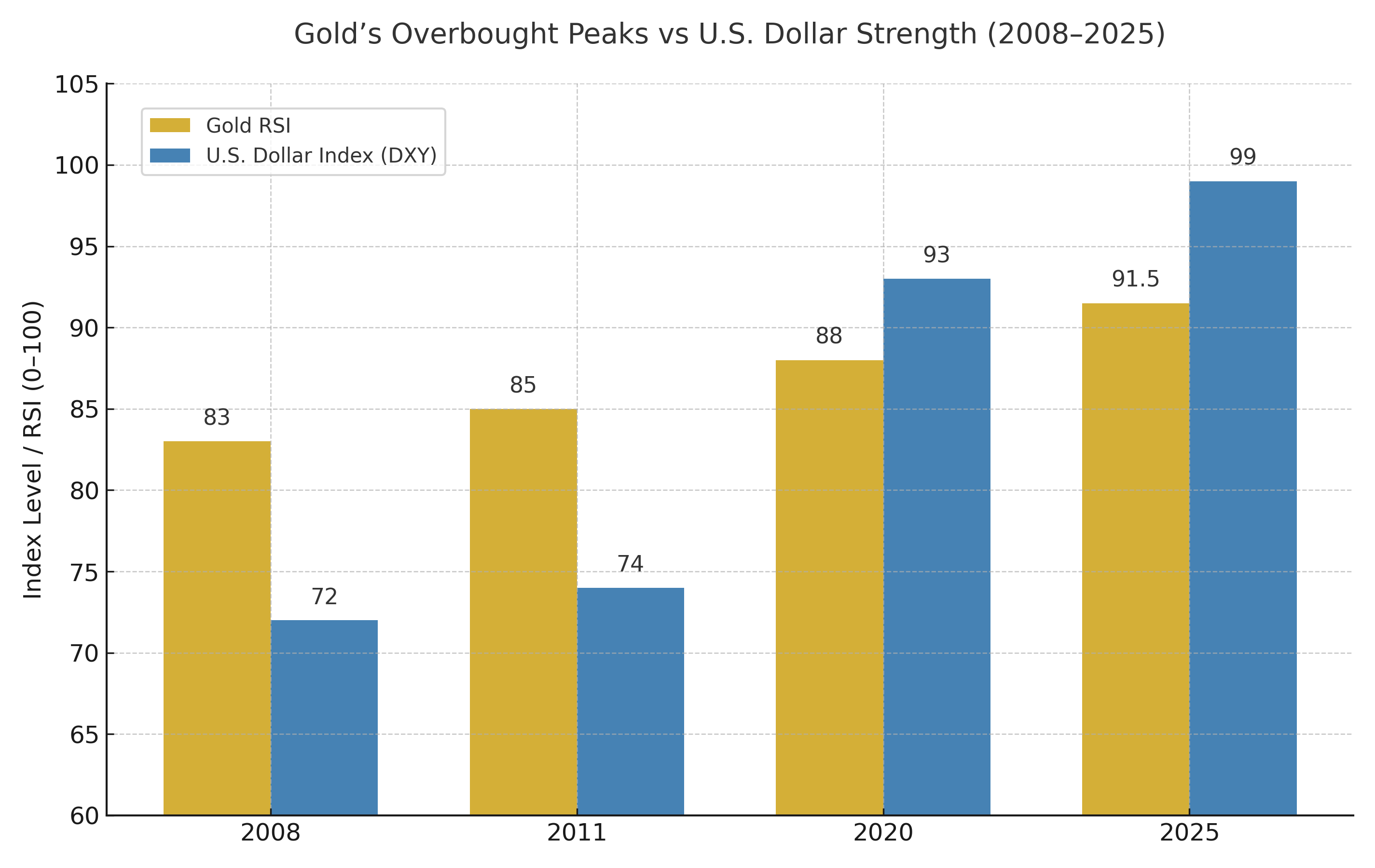 The visual contrast (as shown in the chart above) tells the story: gold’s overbought peaks used to coincide with dollar weakness. Now, that inverse link is gone.